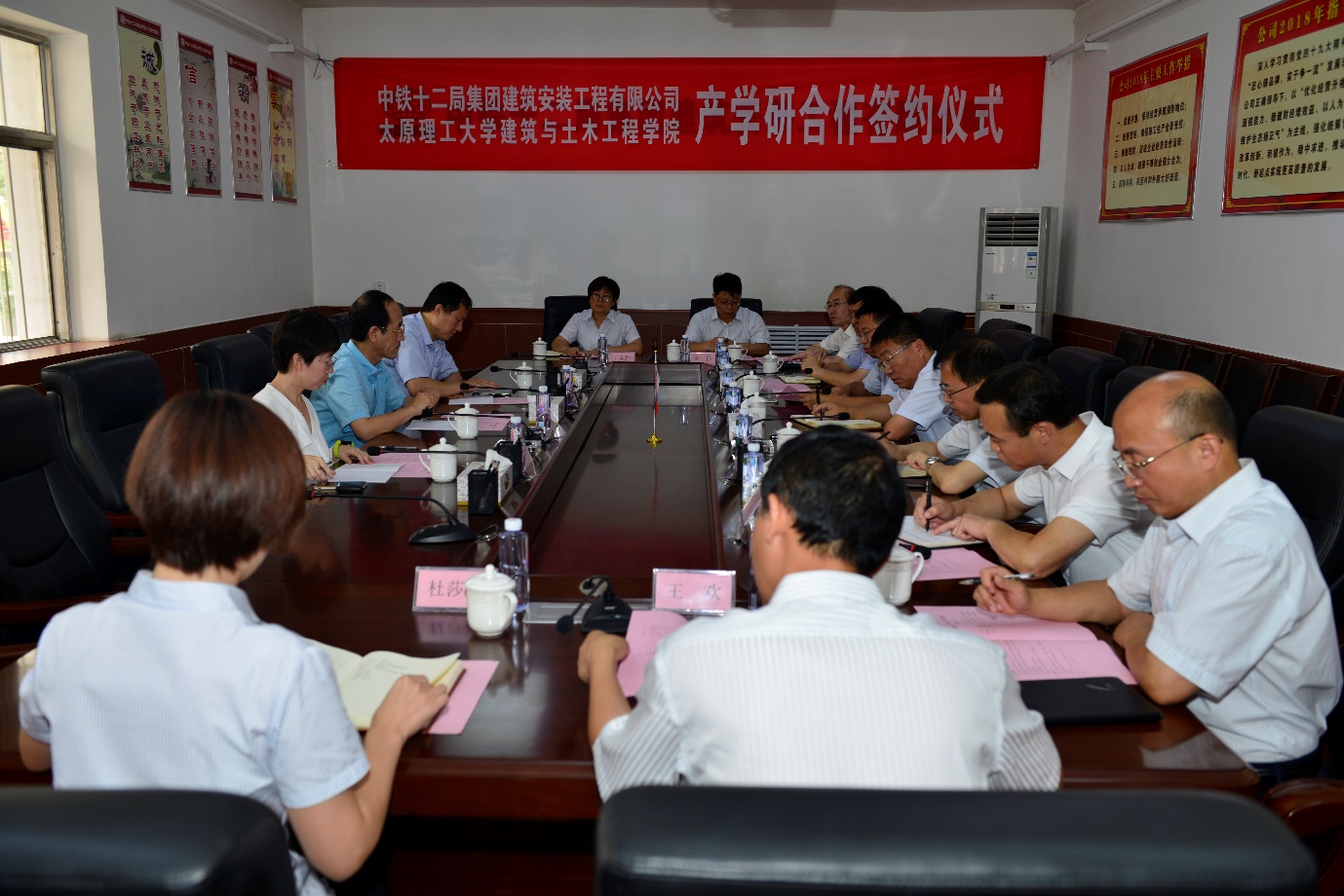 2018年7月8日上午10点,太阳成城集团建筑与suncitygroup太阳集团与中铁十二局集团建筑安装工程有限公司在建安公司会议室举行产学研合作框架协议签署仪式及产学研合作揭牌仪式。建筑与土木工工程学院院长雷宏刚教授、土木系主任董晓强教授、土木实验中心主任刘元珍教授,中铁十二局集团建筑安装工程有限公司董事长、总经理蔡英康、党委书记姜振生、公司副总经理、总工程师王中军、副总经理卢会永、副总工盖宏、副总工解明旭、副总经济师李勇、科技部副部长范伟、科技部副部长王美静、测试中心副主任王欢、科技部部员杜莎莎出席了签约及揭牌仪式。