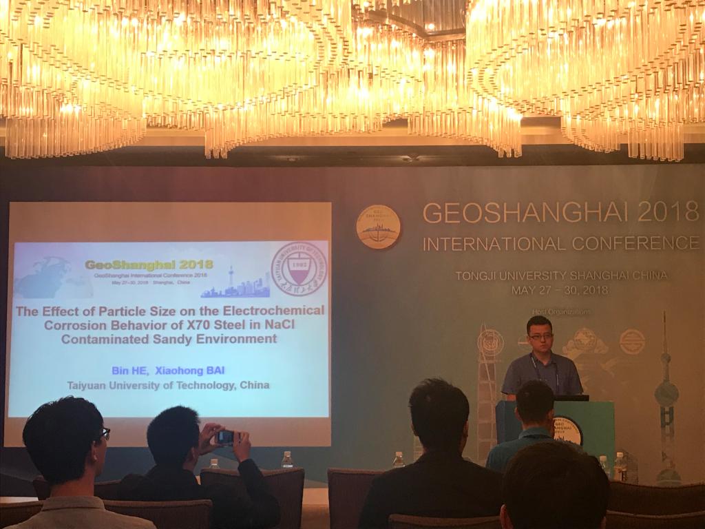 2018年5月27日—30日,何斌博士、谢瑞珍博士生、王效渊博士生、王景霞硕士生参加了在上海WH Ming Hotel举办的4th GeoShanghai 2018 International Conference。来自十多个国家的三百余名代表出席了本次会议。在本次会议上,何斌博士做了题为《The Effect of Particle Size on the Electrochemical Corrosion Behavior of X70 Steel in NaCl Contaminated Sandy Environment》的分会场(Geoenvironment and Geohazards)学术报告,并与参会国内外高校专家和多家企业技术人员进行了学术交流,同时就我院在环境岩土工程方面的研究进行了交流与学习,提升团队在污染土腐蚀性研究方面的知名度。
