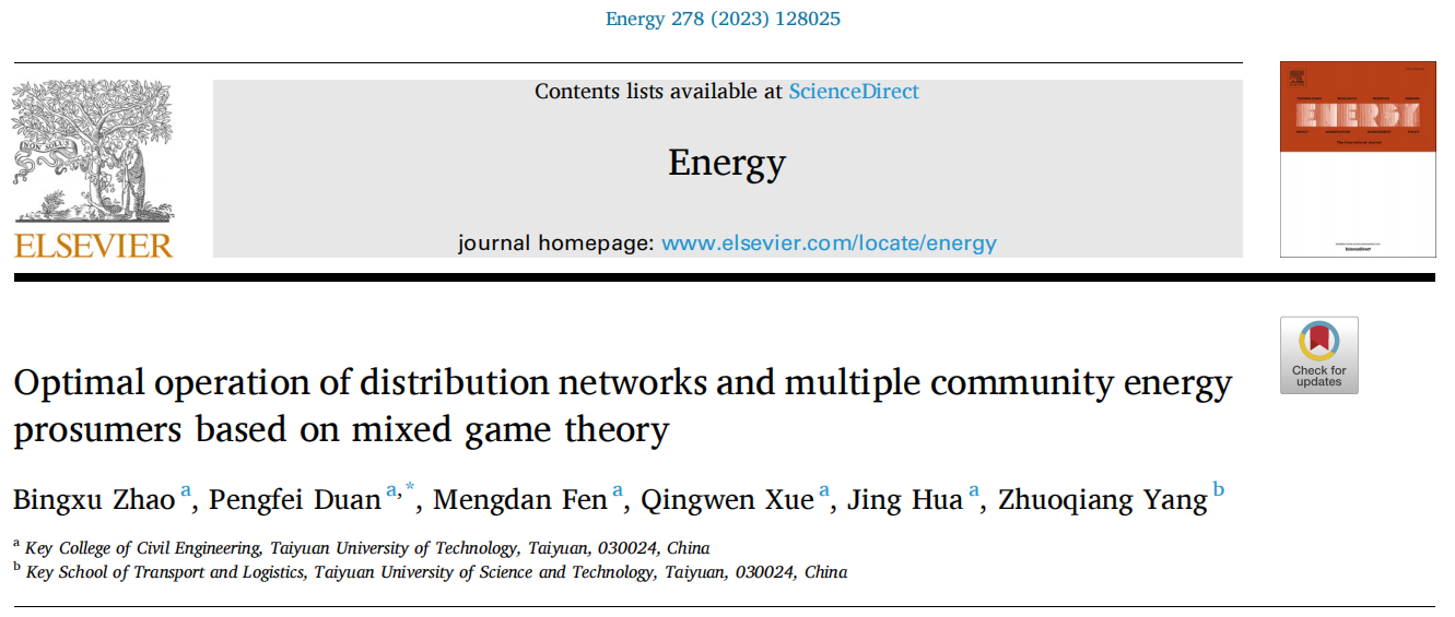近日,我院2020级硕士研究生赵秉旭在国际知名期刊《Energy》发表了题为《Optimal operation of distribution networks and multiple community energy prosumers based on mixed game theory》的研究论文,该论文是以赵秉旭为第一作者、导师段鹏飞为通讯作者,建筑环境控制与可持续能源应用团队薛庆雯、华靖等为共同作者完成,suncitygroup太阳集团为第一作者单位。