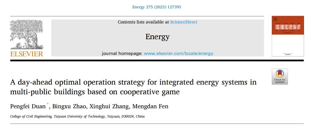 此前,赵秉旭联合导师段鹏飞副教授、共同作者张兴惠副教授以及建筑环境控制与可持续能源应用团队其他成员通力合作的另一研究成果同样发表在《Energy》期刊,题为《A day-ahead optimal operation strategy for integrated energy systems in multi-public buildings based on cooperative game》,该论文suncitygroup太阳集团为唯一作者单位。