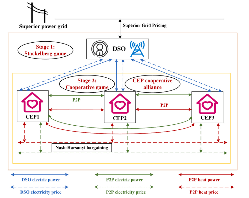 本研究探讨了配电网(DSO)领导下的多个社区能源生产消费者(CEP)的协调管理策略,基于主从博弈和合作博弈结合的混合博弈,建立了DSO和CEP联盟的协调优化模型。上层的优化目标是最大限度地提高DSO的运营收入,下层则最大限度地降低CEP联盟的运营成本,根据Nash-Harsanyi讨价还价理论合理分配合作利益,研究创新性提出两阶段分布式算法对模型进行求解,并引入云储能(CES)来优化CEP的经济性。该研究成果对提升社区分布式能源系统的可再生能源渗透率和对新型能源交易市场的建设具有指导意义。