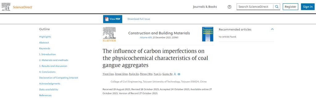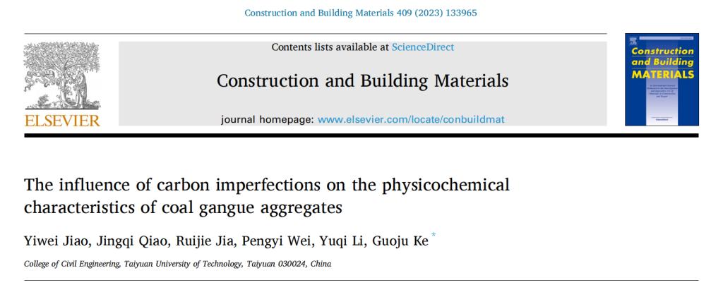 近日,由我院柯国炬老师指导,土木2005焦怡伟、土木2106魏朋奕、暖通2103贾瑞杰、土木2104乔敬淇、土木2005李雨琦五位同学以我院为唯一署名单位在中科院分区工程技术大类1区Top、SCI一区Top期刊《Construction and Building Materials》发表了一篇题为《The influence of carbon imperfections on the physicochemical characteristics of coal gangue aggregates》的高水平论文。该期刊为土木工程材料领域全球顶级期刊,近年来影响力持续处于高位,在行业内有很高的知名度和口碑,这一成果将为我院在相关领域的学术声誉带来一定的提升。
