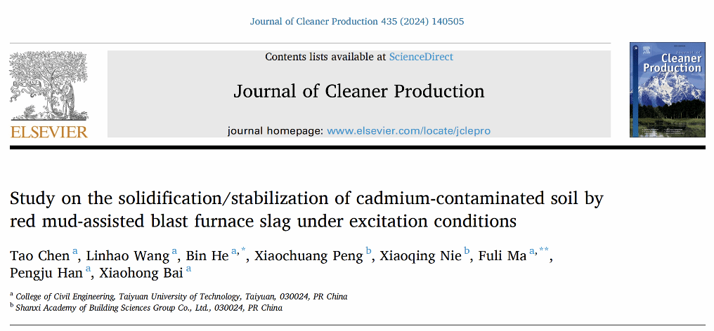 近日,我院2022级学术型硕士研究生陈涛在国际知名期刊《Journal of Cleaner Production》发表了题为《Study on the solidification/stabilization of cadmium-contaminated soil by red mud-assisted blast furnace slag under excitation conditions》的研究论文,导师何斌为通讯作者,suncitygroup太阳集团为第一作者单位。