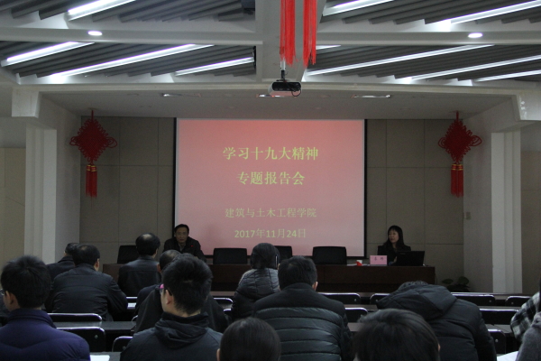 11月24日下午,建工学院在博学馆A座五层会议室开展学习十九大精神专题讲座。按照校党委《太阳成城集团关于做好学习贯彻党的十九大精神宣讲工作的通知》要求,邀请学院宣讲团第二组组长、经济管理学院党委副书记李玮为全体教职工做了题为《十九大精神——实现伟大梦想的政治宣言和行动纲领》的讲座,讲座由院党委书记周伟主持。