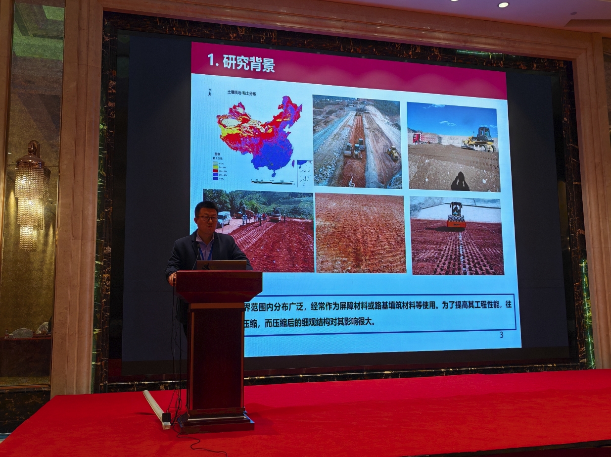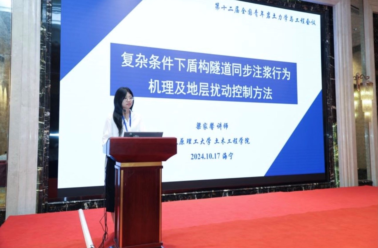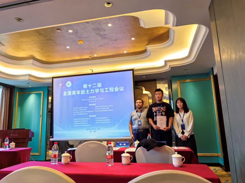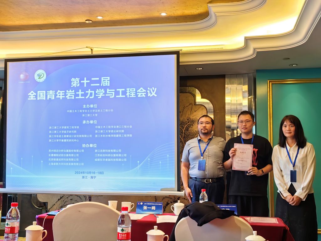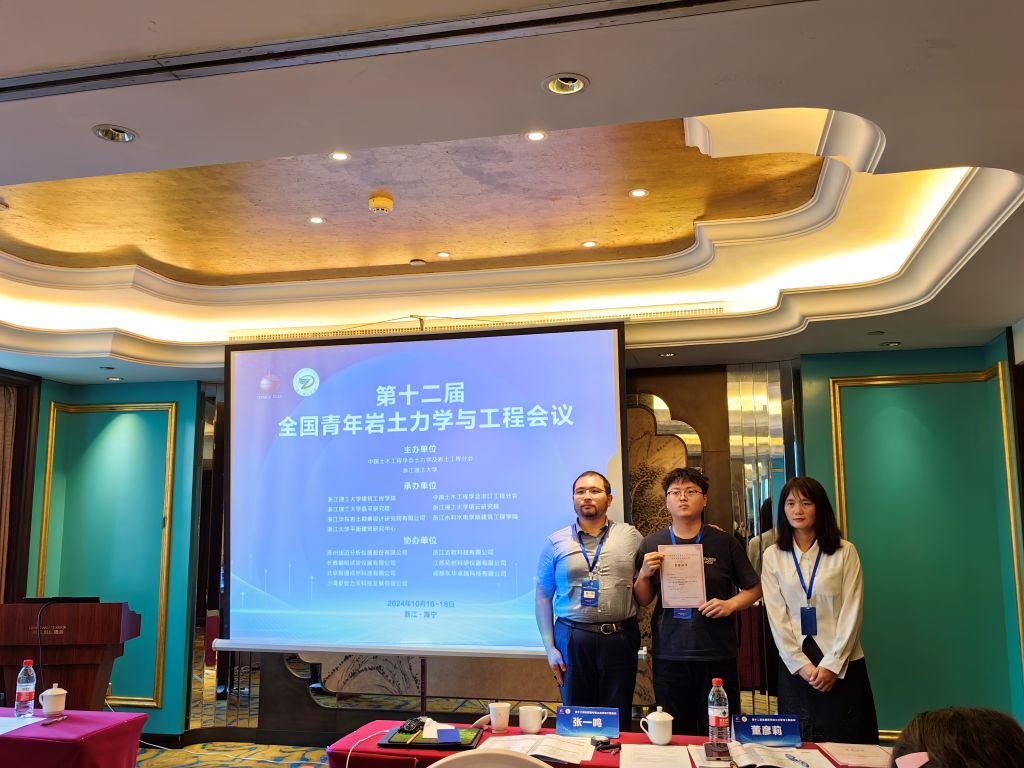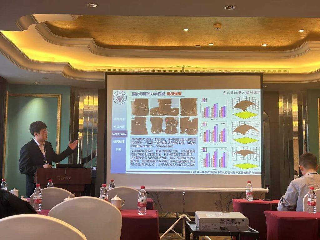 本次会议期间还举行了研究生学术报告会,旨在搭建一个专注于岩土力学与岩土工程领域的学术交流平台,鼓励研究生深入探讨岩土力学与岩土工程的前沿技术、创新应用及可持续发展路径。在报告会上,我院岩土与地下工程研究所董晓强教授的两位博士生崔雯雯、赵晨浩和硕士生贺高乐分别作了题为“基于单纯重心法的全固废赤泥基胶凝材料设计及其水化动力学特性研究”、“盾构同步注浆浆液性能分析及其配比优化研究”和“矿渣-硅灰在碱激发作用下固化赤泥的基本工程性能研究”的学术报告。另外,岩土与地下工程研究所何斌副教授的三位硕士生刘嘉江、朱佳敏和刘克难也分别作了题为“复合絮凝-电渗-固化联合处理高含水率工程泥浆试验研究”、“CFB 粉煤灰抗硫酸盐腐蚀特性研究”和“磷酸激发铁尾矿基地聚物固化油田钻井污泥”的学术报告。