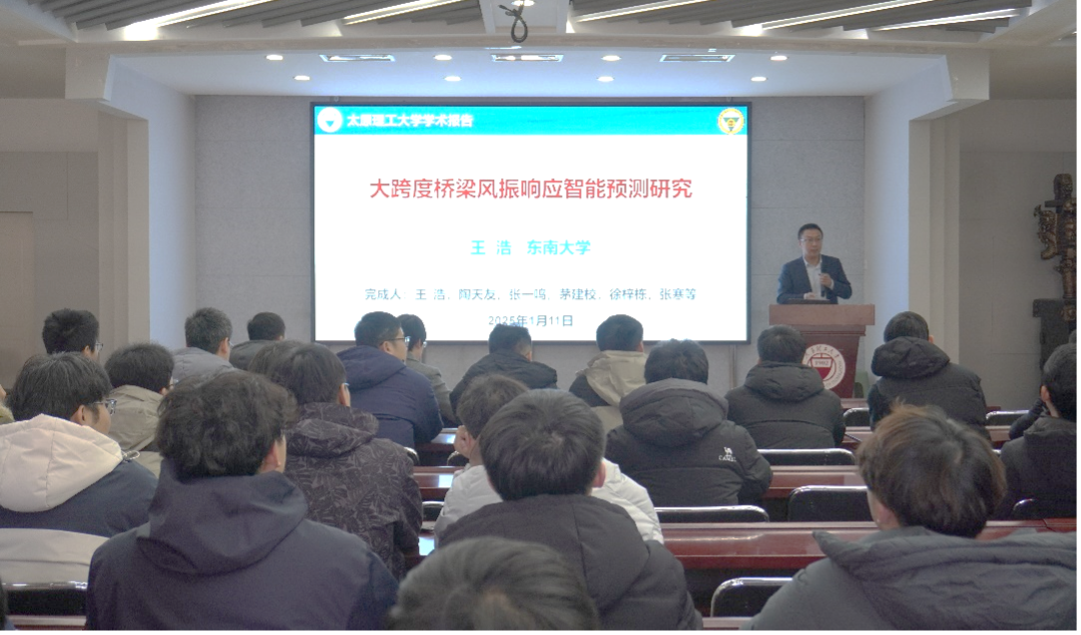 王浩教授的学术报告以“大跨度桥梁风振响应智能预测研究”为题,介绍了课题组在桥梁风振响应智能预测领域的创新方法和研究成果。报告指出,风振问题已成为威胁大跨度桥梁服役安全的关键因素之一,采用风振物理模型与数据驱动的机器学习技术相结合的方法可有效开展桥梁风效应分析。报告围绕海量监测数据异常诊断、桥梁性能参数动态追踪、桥梁风效应智能预测,介绍了课题组在桥梁风振响应智能预测领域的创新方法和研究成果。报告关注学科前沿,针对特异风多发区大跨度桥梁的建设、运维与管理提出了独到见解,现场参会师生反响积极,学术气氛活跃。