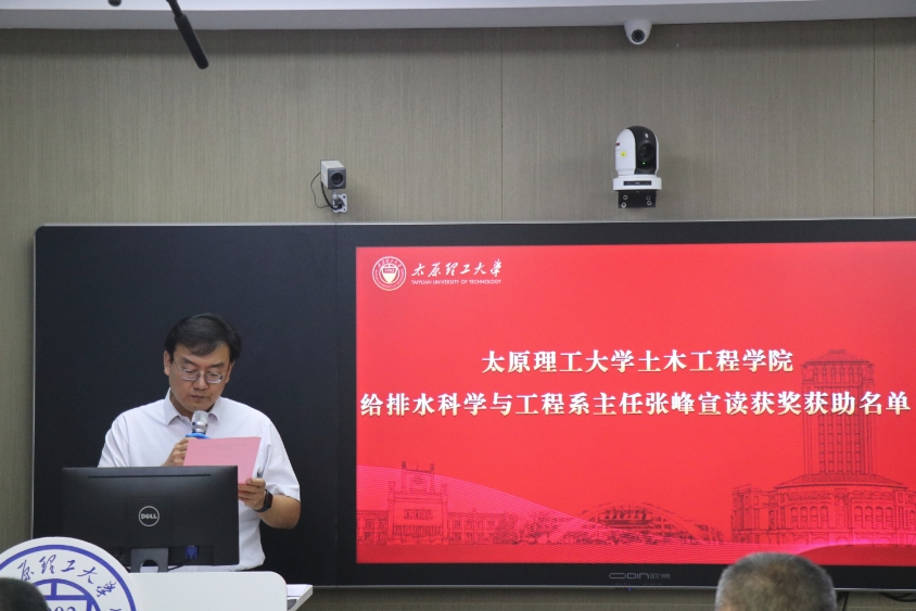 给排水科学与工程系主任张峰宣布太阳成城集团第十二届“进强给排水”获奖获助名单。