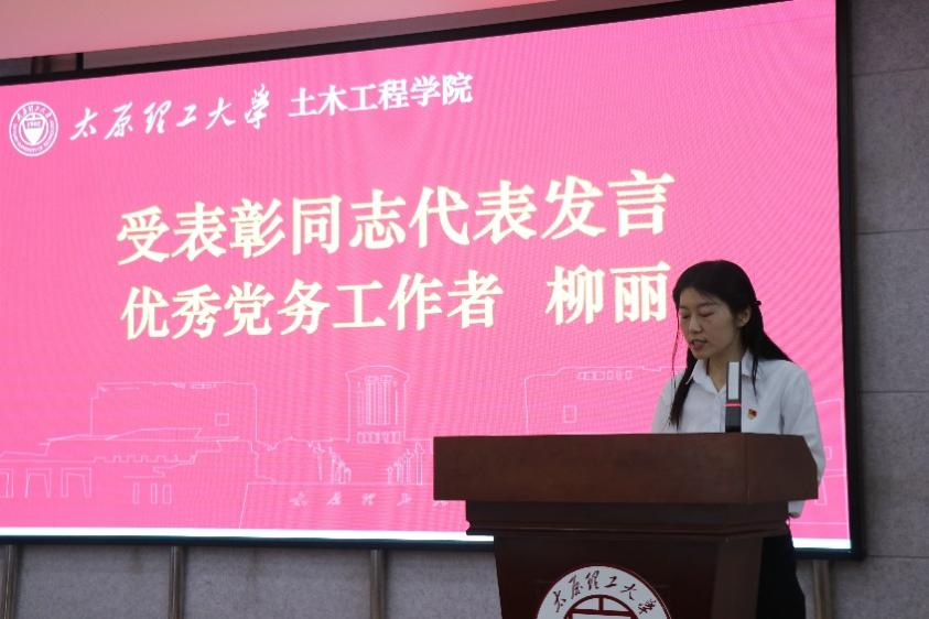 颁奖仪式结束后,优秀党务工作者代表柳丽同志上台发言。她结合自身工作实际,分享了在党务工作中的心得体会,表达了对党的忠诚和对未来工作的展望。她表示,将珍惜荣誉,再接再厉,以更加饱满的热情和更加扎实的作风,为学院党建工作贡献自己的力量。