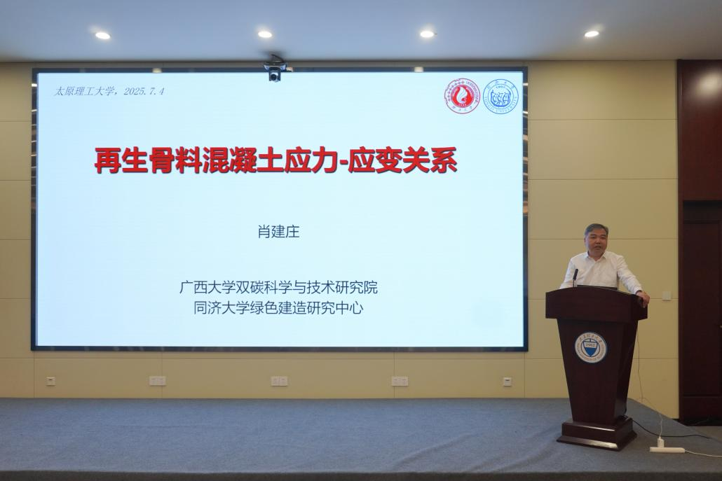 在学术报告中,针对我国城镇化快速发展进程中建筑固体废弃物处置难等问题,肖建庄教授提出再生骨料混凝土循环技术,将传统混凝土结构的生命周期从直链式转变为“再生-再用-再造”的循环式。通过建立“模型再生混凝土”精细化分析方法,肖建庄教授带领的科研团队量化了再生骨料替代率、旧砂浆层等参数对材料力学行为的影响,提出了再生骨料混凝土单轴静力/动力与复杂受力下的应力-应变关系,攻克了旧砂浆附着导致的性能波动难题,实现再生混凝土与原生混凝土结构协同设计。相关成果已纳入国家标准,并成功应用于多项示范工程中。