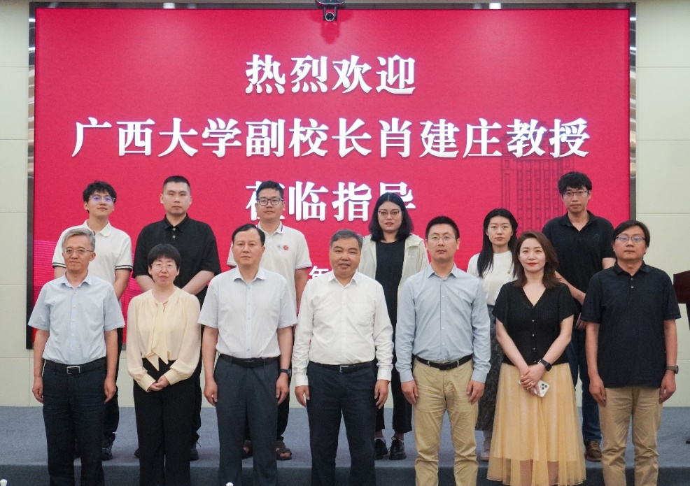 2025年7月4日,suncitygroup太阳集团特邀广西大学副校长肖建庄教授来我校交流,校党委副书记、副校长肖连团与肖校长交流座谈。研究生院院长董晓强,suncitygroup太阳集团院长孙逸飞、副院长刘元珍、张翛、王蕊参加座谈会。