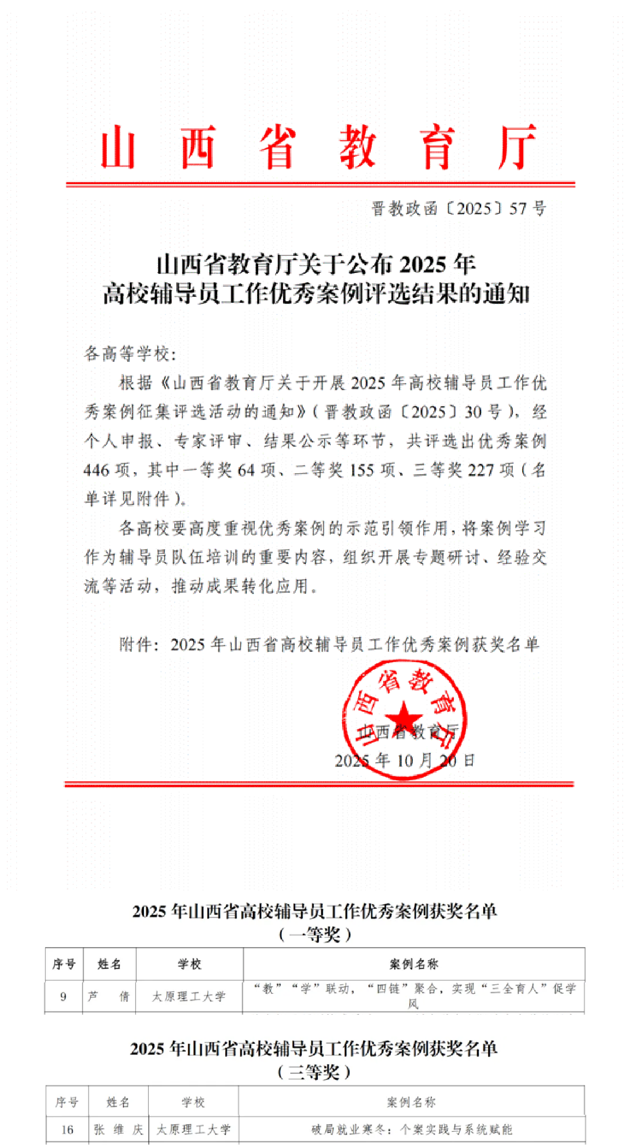 近日,山西省教育厅正式公布2025年高校辅导员工作优秀案例评选结果,我院辅导员团队凭借扎实的育人实践与专业能力获得一等奖和三等奖各一项,充分彰显了学院在辅导员队伍建设与学生工作领域的突出成效。