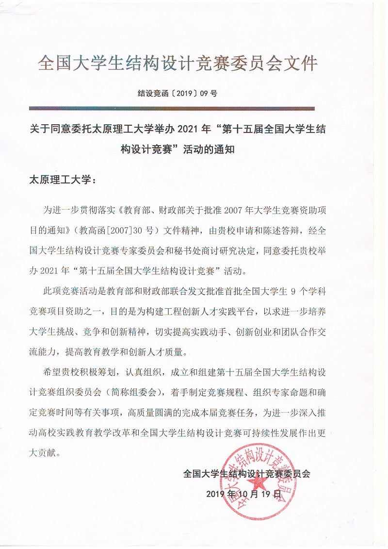 10月19日,全国大学生结构设计竞赛专家委员会在西安建筑科技大学召开,受学院院长、山西省土木工程学科竞赛委员会主任委员雷宏刚教授委托,学院副院长、山西省土木工程学科竞赛委员会副主任委员兼秘书长董晓强教授代表我校进行陈述答辩,就学科优势、组织机构、赛题方案、场馆保障、经费来源、后勤安全、媒体宣传、交通住宿、承办经验等方面进行了详细汇报,并接受了专家组的提问交流,最终我校以周密的承办准备、创新的赛题设计和完备的保障体系得到了一致好评,经专家委员会和秘书处投票表决,同意委托我校举办2021年“第十五届全国大学生结构设计竞赛”。