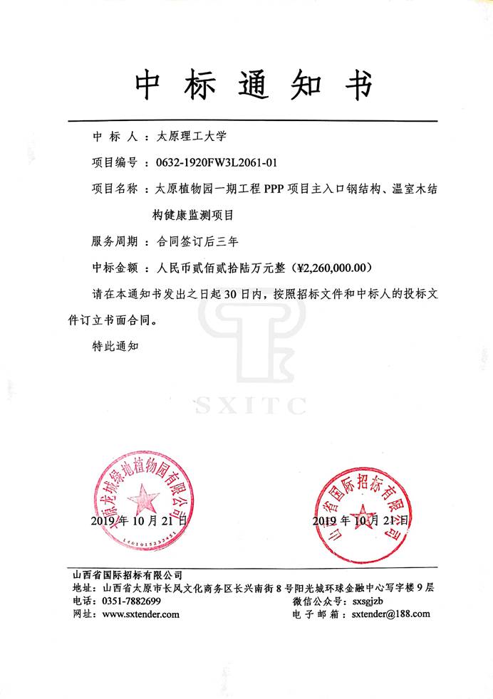 雷宏刚教授作为项目负责人,2019年10月21日代表太阳成城集团参加了太原市重点项目“太原植物园一期工程PPP项目主入口钢结构、温室木结构健康监测”的投标活动。凭借投标方案的优势、团队成果的积累以及业内影响力,在与中冶建筑研究总院有限公司等国内一流强手的激烈竞争中,一举中标,中标金额为226万元。这是继2017年中标“太原南站复杂钢结构健康监测项目(350万元)”之后的又一项重大横向项目。这将为土木工程学科开辟了一个特色方向,也为我校的“双一流”建设锦上添花。