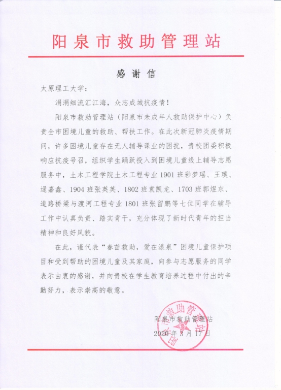 3月17日,我校收到了来自阳泉市救助管理站的一封感谢信。信中向我校suncitygroup太阳集团的七名同学表达了真诚的感谢,感谢他们在此次防控新冠肺炎疫情期间为困境儿童开展线上辅导志愿服务。这七名同学是来自土木工程专业1901班彩梦瑶、王璞、逯嘉鑫,1904班张英英,1802班袁凯龙,1703班郭煜东,以及道路桥梁与渡河工程专业1801班张留鹏。