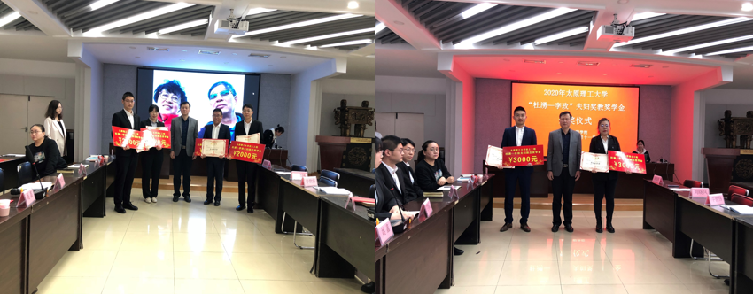 评审委员会主席白晓红教授宣读了2020年“杜湧-李玫夫妇励志奖教奖学金”获奖名单,何斌、肖泽岸两位教师获得“杜湧-李玫夫妇励志奖教金”;李婕、姚鑫、牛世伟、常洪林、王景霞、高黎明六位在读研究生获得“杜湧-李玫夫妇励志奖学金”,董晓强为获奖师生颁奖。