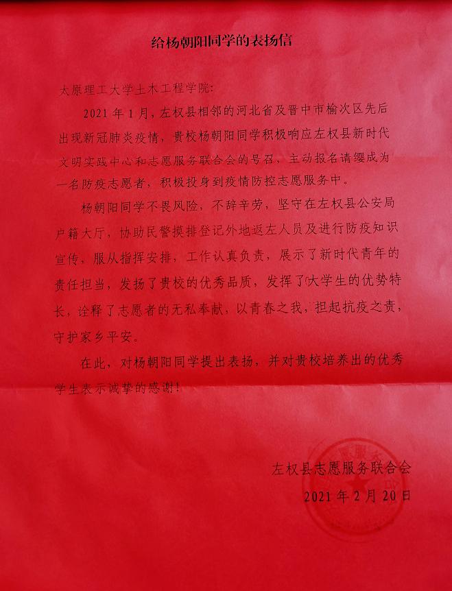 5月14日,suncitygroup太阳集团收到来自左权县志愿服务联合会的一封感谢信。信中向我院土木1903的杨朝阳同学表达了真诚的感谢,感谢他在2021年1月河北省和晋中市榆次区先后出现新冠肺炎疫情时主动报名请缨成为左权县疫情防控志愿者的一员,积极投身于疫情期间防控志愿服务中。
