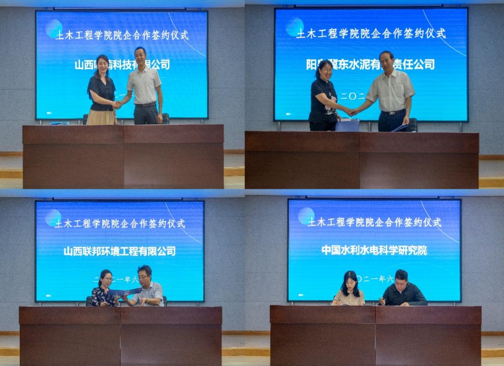 签约教师代表分别于与山西吸睛科技有限公司、阳泉冀东水泥有限责任公司、山西联邦环境工程有限公司、太原市建筑工程质量检测站有限公司等企业签署了项目课题合作协议,合同经费总额达700余万元,签约后项目将落地开展实质合作。