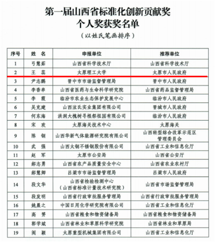 山西省人民政府日前印发了《关于表彰获得第一届山西省标准化创新贡献奖标准项目和个人的决定》(晋政函〔2022〕95号),我院王蕊教授获此殊荣,为今后申报国家级标准创新贡献奖奠定基础。