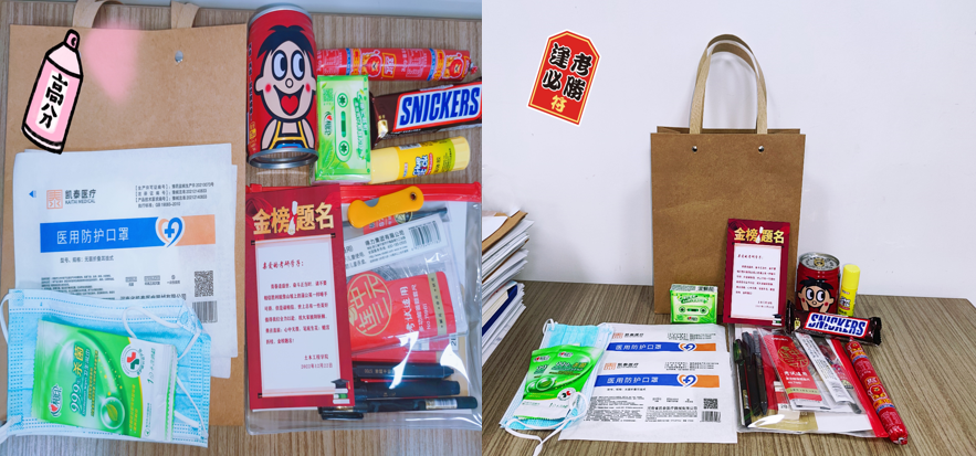 在近期严峻复杂的疫情形势下,学院高度关注学生研考工作,克服了物资、物流等方面的诸多不便,竭尽所能地为每一位考研学子购置了N95口罩、医用外科口罩、消毒酒精湿巾等防疫用品,精心设计了考研文具套装、考研祝福卡片等礼物,并准备了士力架、旺仔牛奶等考研能量套餐,传递关心关爱,切实保障学生平安、健康、从容地参加考研。