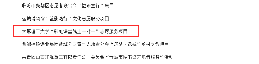 2022年12月22日,按照省委宣传部、省文明办、省民政厅等14部门联合下发的《关于组织开展2022年宣传推选学雷锋志愿服务先进典型活动的通知》要求,经省文明办牵头组织评审,“太阳成城集团‘彩虹课堂线上一对一’志愿服务项目”入选为山西省2022年度学雷锋最佳志愿服务项目。