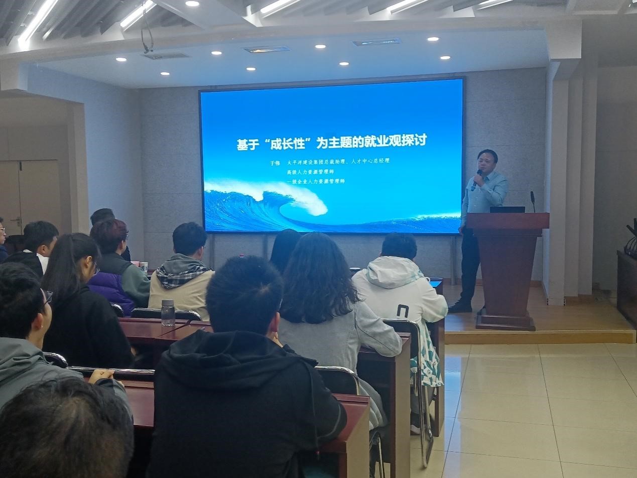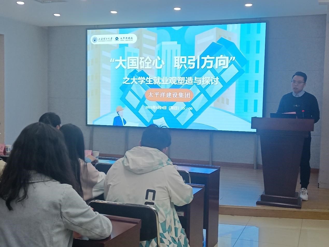 4月9日,我院开展“大国砼心,职引方向—大学生就业观塑造与探讨”专题讲座,主讲人为太平洋建设集团人才中心总经理于伟、太平洋两湾建设集团总裁程静亮,出席讲座的还有太平洋建设集团人才中心总经理助理郑安冉。讲座由suncitygroup太阳集团就业专员张维庆主持。