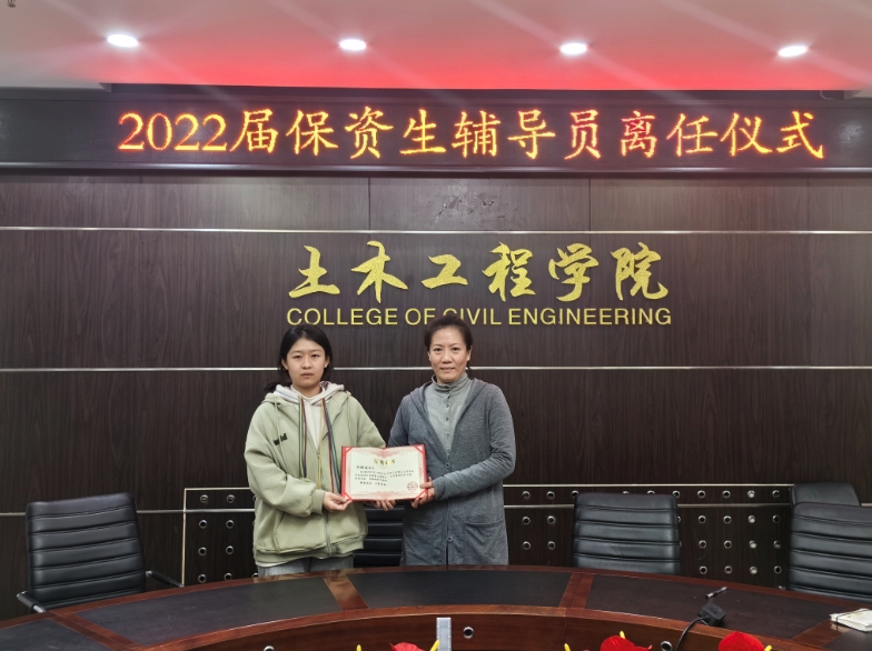 芦倩作总结讲话。她首先对离任保资生的辛勤付出和努力工作表达了感谢,对在疫情防控、活动组织、班级管理等方面发挥的积极作用表示了肯定。她指出,保资生辅导员是学院落实立德树人根本任务的重要环节,在学生工作中承担了重要角色,希望即将离任的保资生辅导员能在今后的学习工作中充分发挥学工经历锤炼的素质优势,肩负时代使命,发扬土木精神,以新的角色继续发光发热。