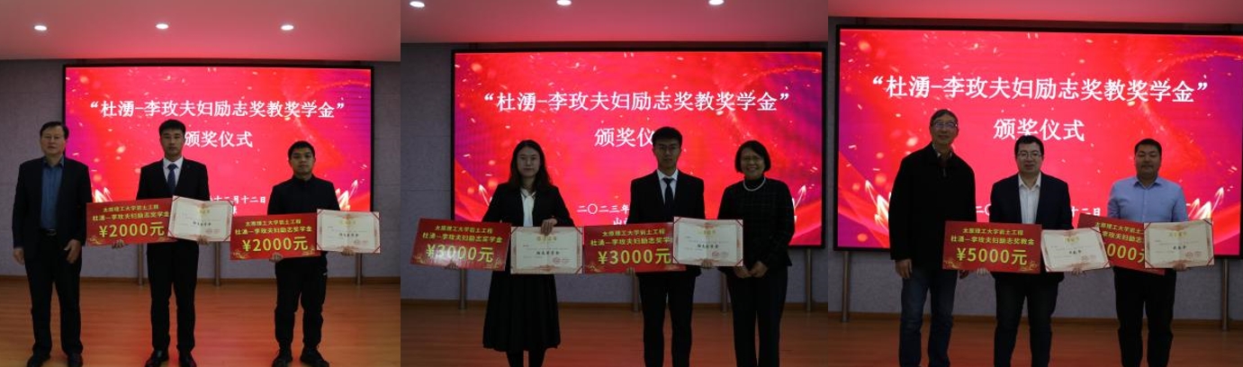 “杜湧-李玫夫妇励志奖教奖学金”是由我校知名校友杜湧先生及其夫人李玫女士结合我院岩土与地下工程研究所的实际情况,为鼓励研究所在校研究生刻苦学习、鼓舞青年教师奋发向上而设立的。