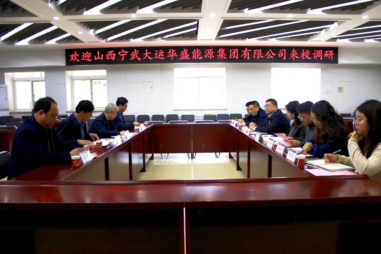2023年3月26日上午,宁武县自然资源局副局长汪渊文、山西宁武大运华盛能源集团有限公司董事长王和平带队,山西大运华盛投资有限公司董事长李军、山西宁武大运华盛能源集团益兴新型建材有限公司董事长高俊一行四人来我院调研交流。学院党委书记武佐君、基础部主任王蕊等出席交流会。会议由煤基固废建筑材料研究所副所长赵晖主持。