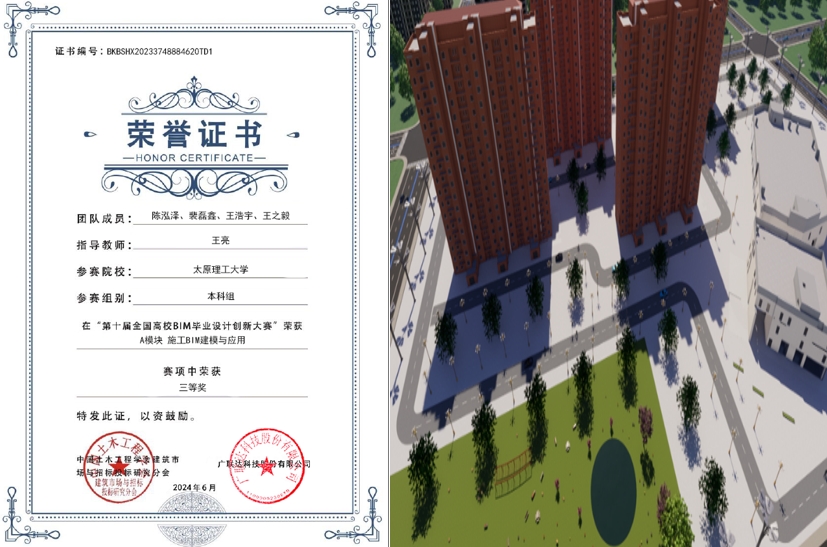 近期,由广联达公司主办的第10届全国高校BIM毕业设计创新大赛落下帷幕。经过激烈的角逐,在王亮等老师的精心指导下,学院取得了令人瞩目的成绩:荣获一等奖1项,三等奖3项以及优秀奖2项,充分展现了学院的创新实力与竞赛水平。