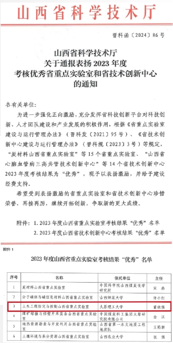 近日,山西省科技厅完成了省重点实验室、省技术创新中心2023年度考核工作,土木工程防灾与控制山西省重点实验室(以下简称“重点实验室”)考核优秀,这也是本年度我校唯一一所考核优秀的省级科技创新平台。本次考核坚持质量、绩效、贡献为核心的评价导向,破四唯,讲贡献,将承担省级以上科研任务、引进培育人才、科技成果转化和科学贡献等作为重要考核评价指标,根据考核结果确定财政支持经费,并实行动态调整和差异化支持措施,实现平台有进有出、分类支持,对于考核优秀的平台,享受“免申即享”政策,直接拨付奖补资金。