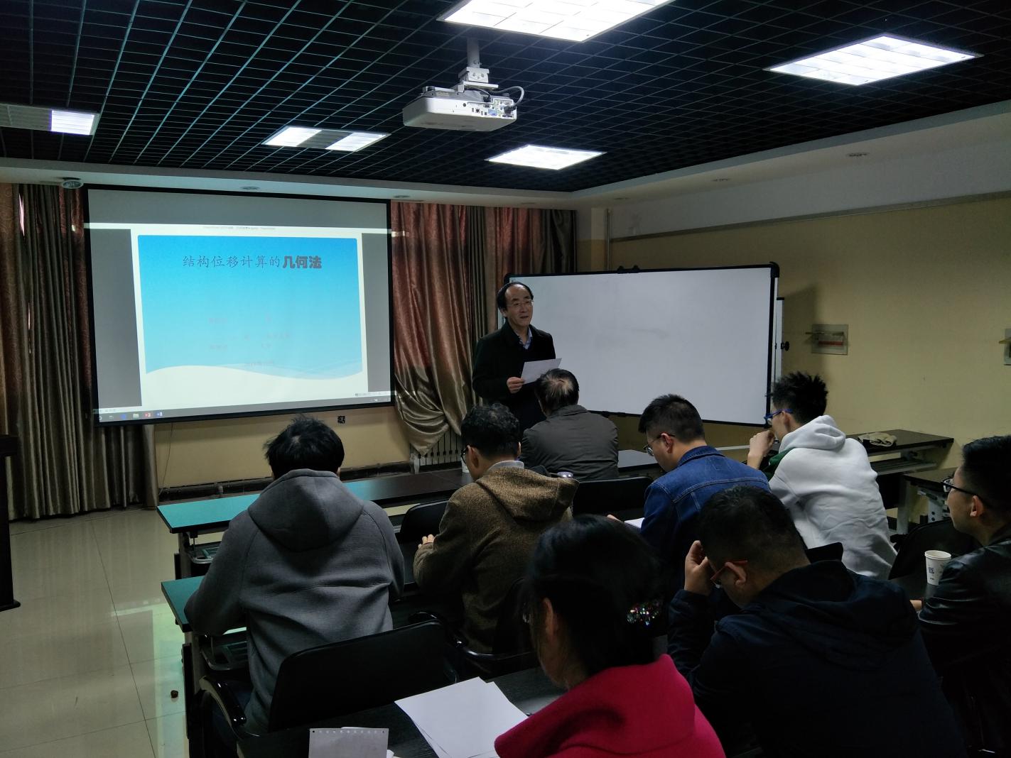 郭教授强调位移计算是结构分析不可或缺的内容,讲述了计算结构位移方法理论的发展,对现有理论方法如虚功法的优缺点进行了点评,而实际工程中常常需要了解位移沿杆件的变化规律以及能力与变形的分析等,这些都要求计算多点位移或绘制位移图,在此基础上,提出了一种求解结构位移的几何算法。本次报告,郭老师主要针对受弯杆件和轴力杆件的位移计算进行了深入地讲解,在讲解过程中,引入大量实例,加深了听者对几何法的理解。会后,关于几何法,郭教授与老师、学生们进行了进一步交流。