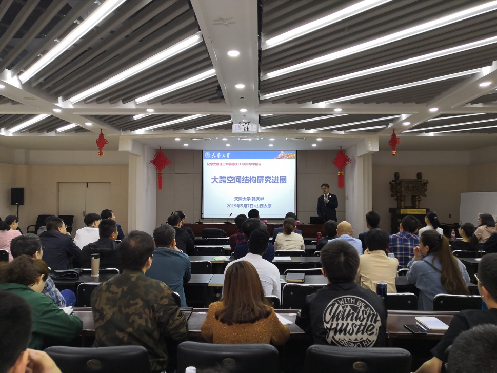 应学院的邀请,天津大学教授、博士生导师韩庆华于2019年5月7日到访我院,在博学馆五层会议室做了题为“大跨空间结构研究进展”的学术报告,由雷宏刚院长主持,土木系师生100余人聆听了此次报告。
