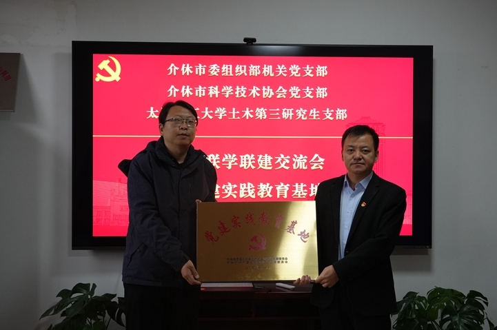 在活动仪式上,支部书记何斌代表支部与介休市委组织部机关党支部李晓东常务副部长和介休市科学技术协会党支部郭俊主席共同签署了党组织结对共建协议,并共同为党建实践教育基地揭牌。