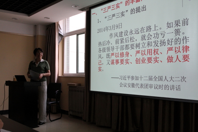 她强调要根据校党委的安排部署,扎实开展“三严三实”专题教育,在巩固和拓展党的群众路线教育实践活动和学习讨论落实活动成果上见实效;在守纪律讲规矩、营造良好政治生态上见实效;在真抓实干、推动改革发展稳定、不断提升全体师生获得感上见实效;在塑造干部队伍良好形象上见实效。