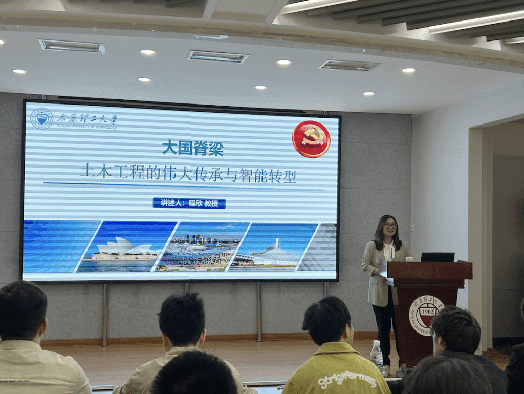 开班仪式结束后,建工系党支部书记程欣以《大国脊梁 土木工程的伟大传承与智能转型》为主题,将专业教育与党建学习深度融合。她以钱七虎院士等行业楷模为榜样,深入剖析土木工程行业现状,系统梳理学科发展历程中的四次重大飞跃,以及当下向智能化转型的关键趋势。生动的案例、详实的数据,让学员们深刻认识到土木工程专业在国家基础设施建设中的重要地位,激励广大学员以专业所学服务国家战略需求,在行业领域勇担党员使命。
