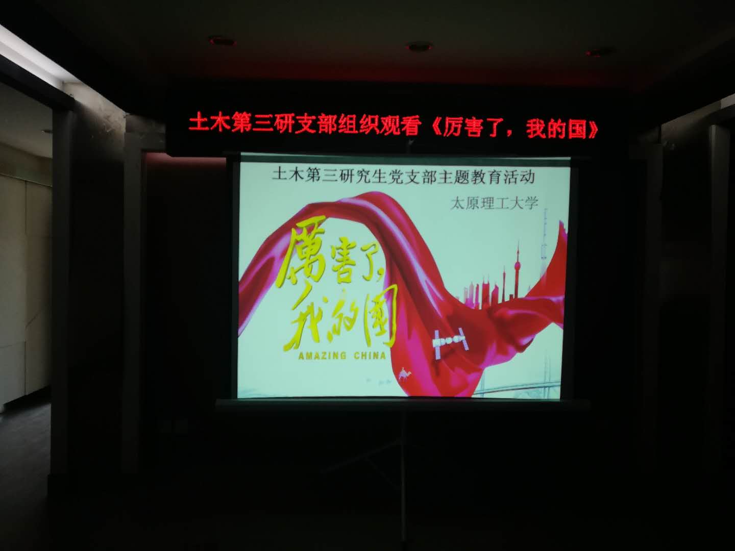为深入学习贯彻习近平新时代中国特色社会主义思想和党的十九大精神,不断加强和改进学生思想政治工作,引导同学们增强“四个意识”,坚定“四个自信”,使同学们能够全面了解、掌握党的十八大以来中国在各方面取得的改革开放和社会主义现代化建设历史性成就。2018年5月8日下午,建工学院土木第三研究生党支部在博学馆五层组织了观看纪录影片《厉害了,我的国》主题教育活动。本次活动由支部书记何斌同志主持,共有29名同志参加,其中正式党员20名,积极分子9名。