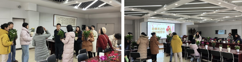春回大地,花香满室。在第115个国际劳动妇女节即将到来之际,为丰富学院女教职工文化生活,传递节日祝福,展现女性风采,院工会于2025年3月5日下午在学院五层会议室举办了“赴春天之约 绽巾帼芳华”绿植插花主题活动。学院50余名女教职工齐聚一堂,以花为媒,以绿为伴,体验自然之美,共赴春日之约。