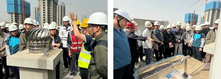 在样板展示区域,1:1还原的通风屋顶、构造节点、剪力墙连接等多个实体样板映入眼帘,成为学生们眼中的“立体教科书”。专业教师及项目方代表结合《混凝土结构》《施工技术》等课程内容,现场讲解节点布置、钢筋锚固、结构防护等细节,同学们纷纷驻足拍照、绘图记录,理论知识在现场得到了可视化呈现。近距离观摩实体样板,让学生们了解了课本知识在实际工程中的具体表现形式,深入体会了结构设计与施工细节之间的逻辑关联,增强了理论联系实际的能力。