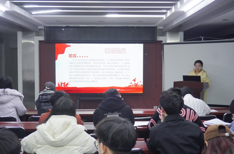 会议伊始,组织理论学习——“南昌起义”。支部党员郭珣同志介绍了南昌起义的背景过程,她也强调,在2017年8月1日,庆祝中国人民解放军建军90周年大会上,中共中央总书记、国家主席、中央军委主席习近平用“三个伟大事件”评价了南昌起义的重要意义和历史贡献:“这是中国共产党历史上的一个伟大事件,是中国革命史上的一个伟大事件,也是中华民族发展史上的一个伟大事件。”随后播放了南昌起义的相关视频资料,帮助党员同志们加深理解记忆。