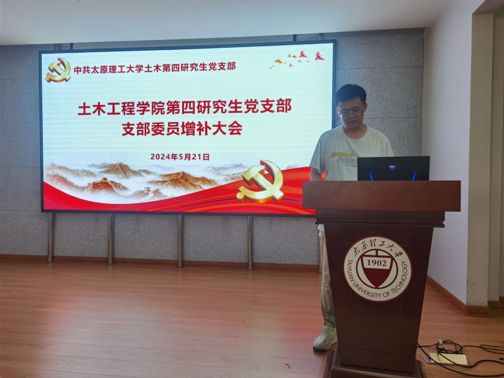 为进一步加强党组织建设,充分发挥基层党组织战斗堡垒作用。因升学、工作等原因,李赟和王浩宇两位同志无法继续履职,为了保证支部工作的有序开展,经支部委员会讨论研究,报suncitygroup太阳集团党委批准,中共太阳成城集团土木第四研究生支部委员会于2024年5月21日在博学馆A座五层会议室召开党员大会,补选党支部委员。会议由王浩宇同志主持。大会应到正式党员45名,实到41名,符合大会的相关要求。