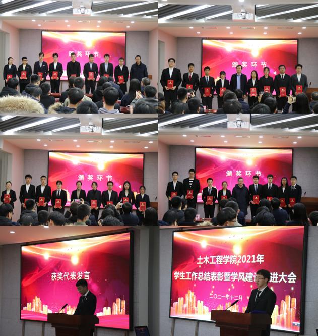 Lu Qian, deputy Secretary of the Party Committee, delivered the student work report in 2021 where she systematically reviewed the achievements of this year's student work from the aspects of Party history study and education, epidemic prevention and control and safety education, scientific and technological innovation, network ideology and politics, and the "San Ge YI Qian" project, and looked forward to the next year's work. Ge Xinsheng, Vice Dean, read out the commendation decision of advanced collectives and individuals, and the leaders of the academy award prizes to the winning individuals and individuals. Then, Zhang Zijian in Class 1901 in Road and Bridge major and Hu Ruiwei in Class 2002 of Civil Engineering major spoke on behalf of the winning students. They shared their experience and growth process, showing the excellent quality and vigor of civil engineering students who are diligent and studious and calling on students to study hard and live up to their youth with full enthusiasm and high morale.