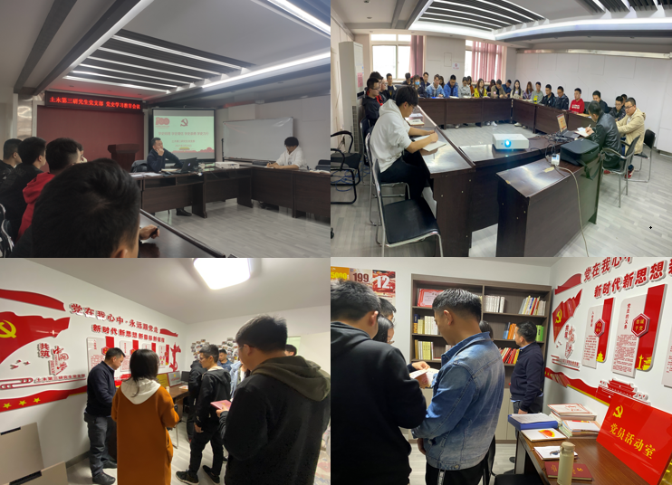 3月26日,土木第三研究生党支部在博学馆A座5层岩土会议室开展了党史学习教育。支部党员通过讲授党课、观看《榜样5》专题节目的方式,重温党的光辉历程。随后,支部为党员发放了学习笔记本,组织参观了支部活动室,以此鼓励大家深入学习党的理论,共同践行省级样板党支部要求,争做新时代合格党员。