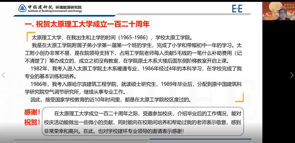 在学术交流报告结束后,会务组还邀请了不同地区各个岗位的20多位暖通校友代表们发言致辞。校友代表们包括了79级校友、暖通系退休老教师代表王飞教授,88级校友、太原市热力设计院有限公司总经理梁鹂教授级高工,88级校友、中核第七设计院有限公司建筑工程设计院院长李侃教授级高工,95级校友、山西大地环境资源有限公司总经理赵文强,20级校友、北京华清荣昊新能源开发有限公司副总经理武雪峰,09级校友、西南交通大学特聘副教授余敏,11级校友、中国人民解放军某部少校副队长郝秀渊,12级校友、加拿大康卡地亚大学零能耗建筑研究中心李经博士,14级校友、山西省建筑太阳集团院绿建所所长张马斌等,他们分别通过视频连线的方式回顾了校园生活的美好记忆,表达了对母校、对老师们的感激之情,并送上了对母校120周年校庆的深深祝福。部分因为工作原因不能连线的校友们也纷纷通过微信传递了对母校的诚挚祝愿。
