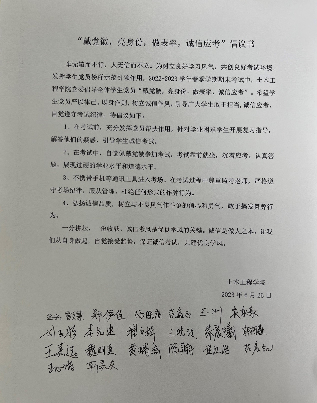 党员代表郑伊佳领读倡议书,与会全体学生党员共同签字承诺:考试期间佩戴党员徽章进入考场,严格遵守考试的规定和守则,自觉接受监考老师和同学的监督。