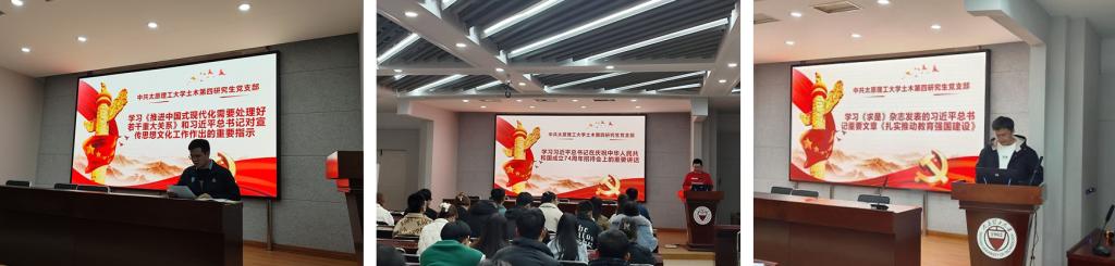 随后,党支部书记邱斌、宣传委员王浩宇、组织委员李赟分别领学了“推进中国式现代化需要处理好若干重大关系和习近平总书记对宣传思想文化工作作出的重要指示”、“习近平总书记在庆祝中华人民共和国成立74周年招待会上的重要讲话”、“扎实推动教育强国建设”,支部党员就此进行了学习讨论。