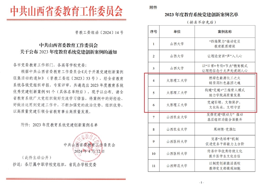 4月12日,中共山西省委教育工作委员会下发《中共山西省委教育工作委员会关于公布2023年度教育系统党建创新案例的通知》(晋教工委组函〔2024〕14号)。我院土木第三研究生党支部提交的《党建引领 文物保护 文化传承 文明守望》党建创新案例,成功入选山西省2023年度教育系统党建创新案例。
