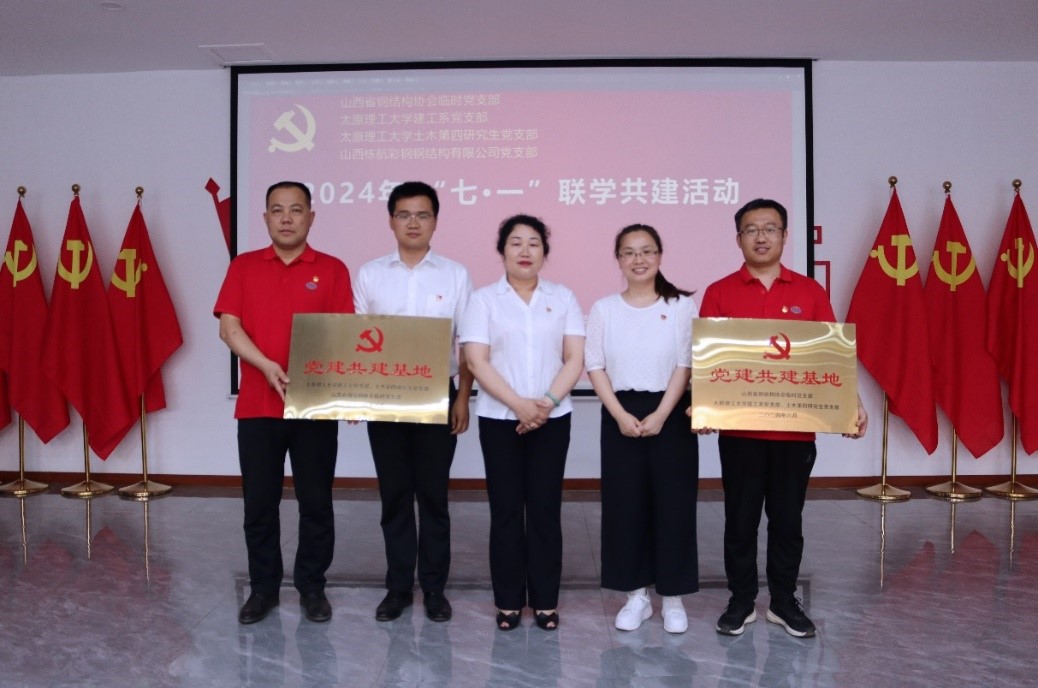 为庆祝中国共产党成立103周年,进一步深入学习贯彻落实习近平新时代中国特色社会主义思想及党的二十大精神,全面推进基层党组织建设,积极探索“党建+业务”深度融合模式,构建“党建引领、校企合作、发展共赢”的党建新格局。2024年6月28日上午,太阳成城集团建工系党支部联同土木第四研究生党支部、山西省钢结构协会临时党支部和山西栋航彩钢钢结构有限公司,共同举办了七一党建共建活动,并举行了党建共建基地的揭牌仪式。参加此次活动的主要人员有:山西省钢结构协会临时党支部书记沈沛鸿、会长李海旺、秘书长兼支部副书记石彦卿、常务副会长张波、副秘书长李卫文,太阳成城集团建工系党支部书记程欣、副书记孟宪杰、党小组组长刘瀚超,土木第四研究生党支部书记邱斌及山西栋航彩钢钢结构有限公司董事长王国栋、总经理闫峰、总工程师朱学强、业务总监霍永结、生产总监王飞、财务总监曹彩庆、党支部书记张继良等。