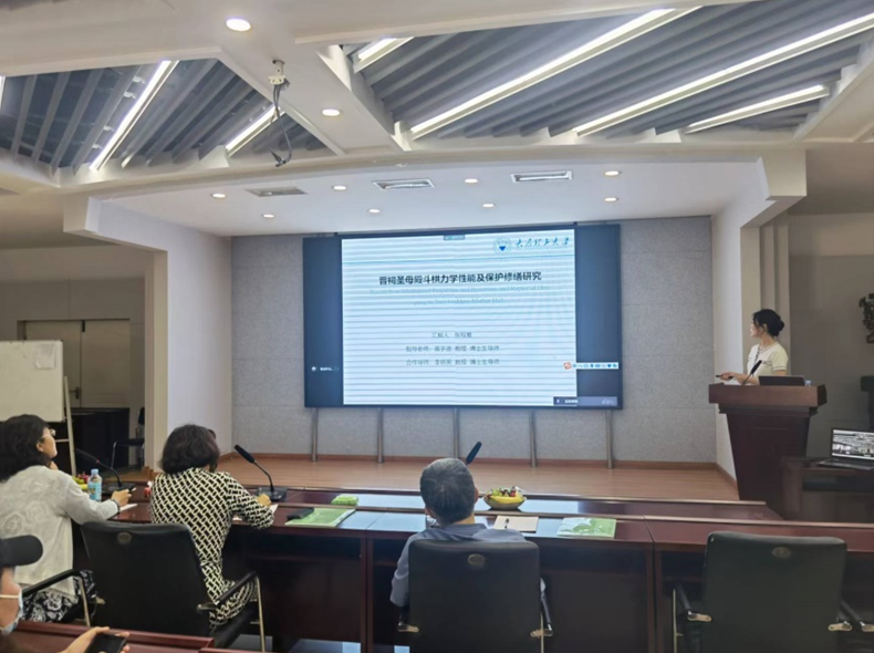 张程雅报告题目为《晋祠圣母殿斗栱力学性能及保护修缮研究》,通过圣母殿斗栱结构解析、力学性能试验及数值模拟、实际残损状况三个方面的研究,提出了圣母殿斗栱的力学模型,并结合木构古建筑修缮、监测方法,对晋祠圣母殿斗栱提出有针对性的保护方案,为圣母殿斗栱后续力学性能研究及科学保护提供依据,从而保护这一文化遗产的结构安全,继续传承其价值。王宏业总工及李铁英教授对张程雅的研究成果给予了肯定,指出课题在深入研究晋祠圣母殿斗栱力学性能基础上提出保护方法,很好的结合了建筑学专业和结构工程专业的知识,选题合理,并且能较好的应用于实际的保护中。导师高宇波教授对张程雅的博士阶段及论文成果给予高度肯定,并鼓励其继续深入相关的研究内容。