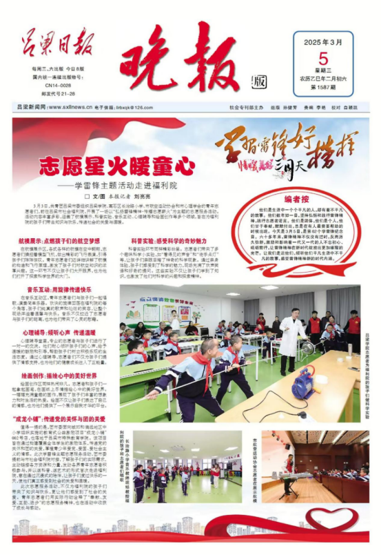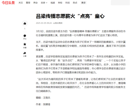 为深入贯彻落实雷锋精神,传递社会关爱,在共青团吕梁市委的组织下,2025年3月3日下午物理与电子信息工程系大学生志愿者们由格物实验室负责人车海亮博士、系分团委负责人李丽老师带领,同离石区长治路小学、市航空运动协会市心理协会的青年志愿者们,共同前往吕梁市社会福利院举办了“弘扬雷锋精神,传播志愿薪火”学雷锋主题志愿活动。该活动同时得到了《吕梁日报》、“山西共青团”官方账号的报道。