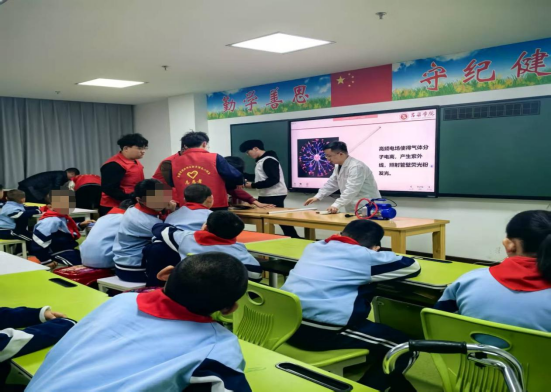 在活动过程中,李丽老师带领志愿者们负责维护现场秩序,搬运实验器材、控制现场灯光,在互动环节中保证学生的安全,对于行动不便的儿童给予了短途辅助移动,以保证活动的顺利进行。志愿者们在与孩子们的互动和实际付出中,收获了深刻的情感体验与精神成长,他们体会到了真正的志愿服务,是用真诚换取信任,用坚持传递温暖。